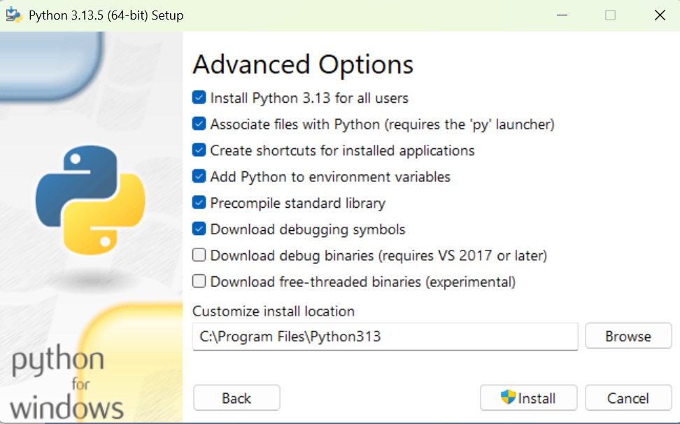 「…for all users」にチェックをいれるのは、インストール先が通常 C:\Program Files\Python313\ になるようにするためです。システム的に標準的な場所にインストールされるので、開発環境や他のソフトがPythonを見つけやすくなります。また、IDE(VSCodeなど)など一部のソフトウエアがこのパスを前提にしているため、互換性が高くなります。