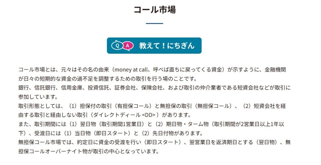 - 預金金利について難しいと感じました。コール市場について具体的に教えていただきたいです。