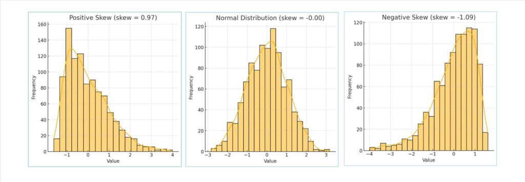 歪度は、データの分布の非対称性を示す指標であり、平均よりも大きい(右側の)データが多い場合、歪度は**正(プラス)になります。逆に、平均よりも小さい(左側の)データが多い場合、歪度は負(マイナス)**になります。